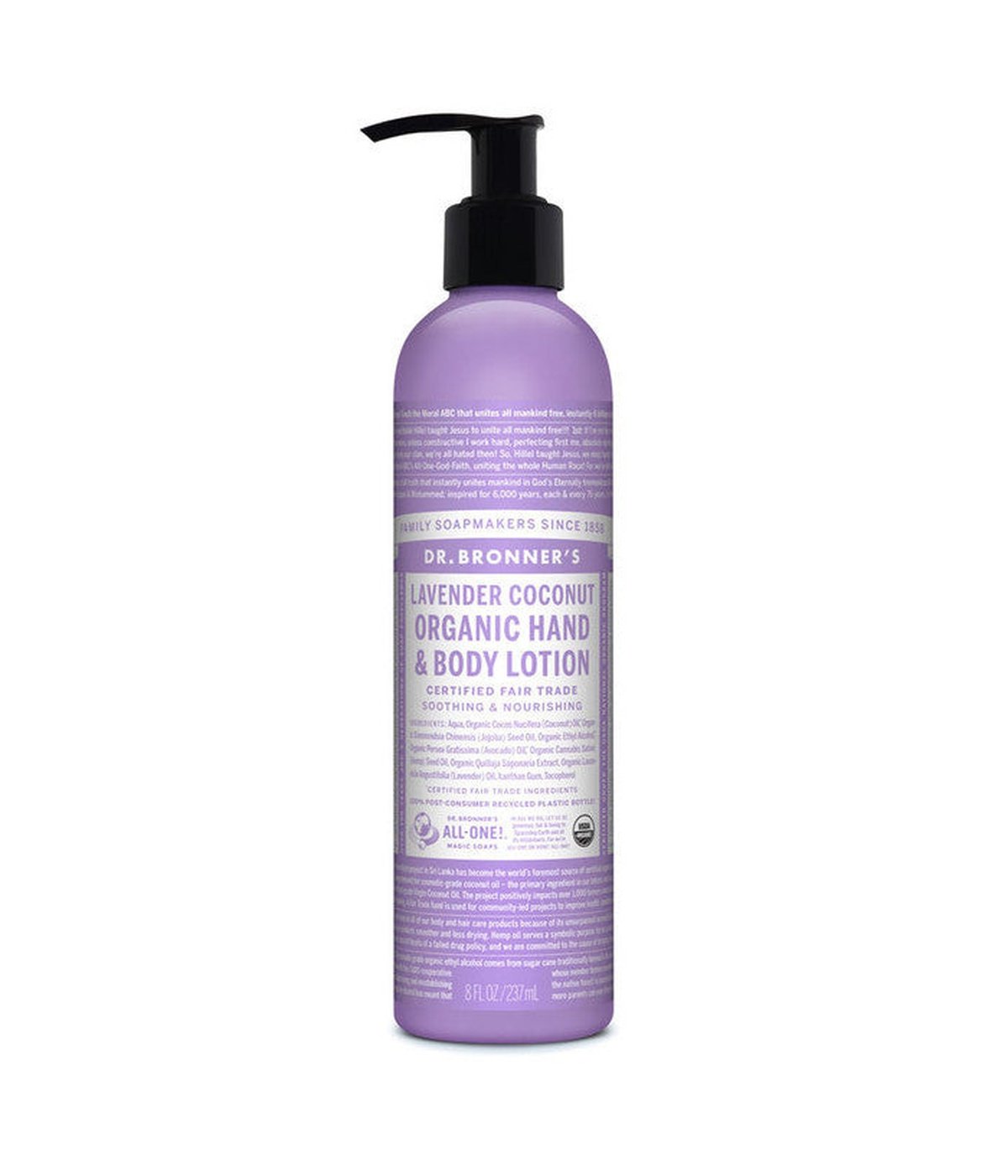 Dr Bronners Organic Hand & Body Lotion has a beautiful scent of Lavender and Coconut that will help you relax and unwind throughout the day. Made with Organic Coconut Oil which is well known for its ability to offer intense hydration to your skin, while Organic Hemp Seed Oil helps to keep skin smooth and supple.
