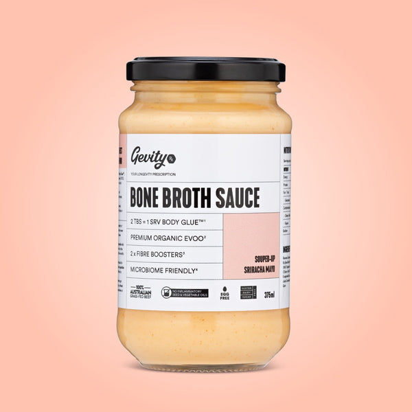 Delicious and healthy, GEVITY Rx Souped-Up Sriracha Mayo packs a punch of flavor with a hint of heat. Every 2 tablespoons of the creamy sauce contains a serving of Body GlueTM, making it easier than ever to get the benefits of the world's most nutrient-dense bone broth. Organic EVOO, Psyllium Husk, and ACV deliver prebiotic fiber for gut health, and the 375mL jar is free from egg, gluten, dairy, soy, and artificial ingredients. Enjoy and indulge guilt-free!
