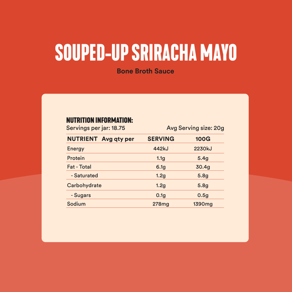 GEVITY Rx Bone Broth Sauce Souped-Up Sriracha Mayo 375mL is a delicious condiment that adds an exciting twist to finger foods. Our bone broth-infused mayo adds a subtle kick of spiciness to take your wings, burgers, and chips to the next level. Experience the perfect balance of taste and texture today!