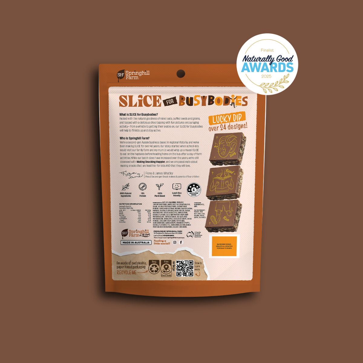 Packed with the natural goodness of rolled oats, puffed seeds and grains, and topped with a delicious choc topping with fun pictures encouraging activity - from a whistle to getting their skates on, our SLICE for Busybodies will help to fill kids up and stay active.